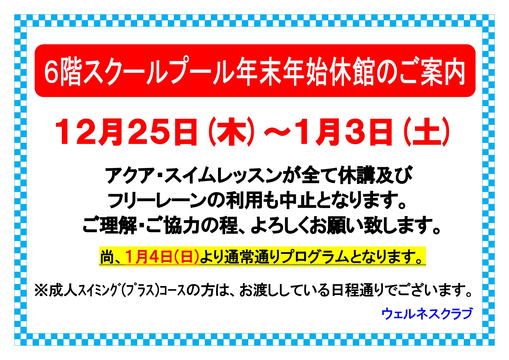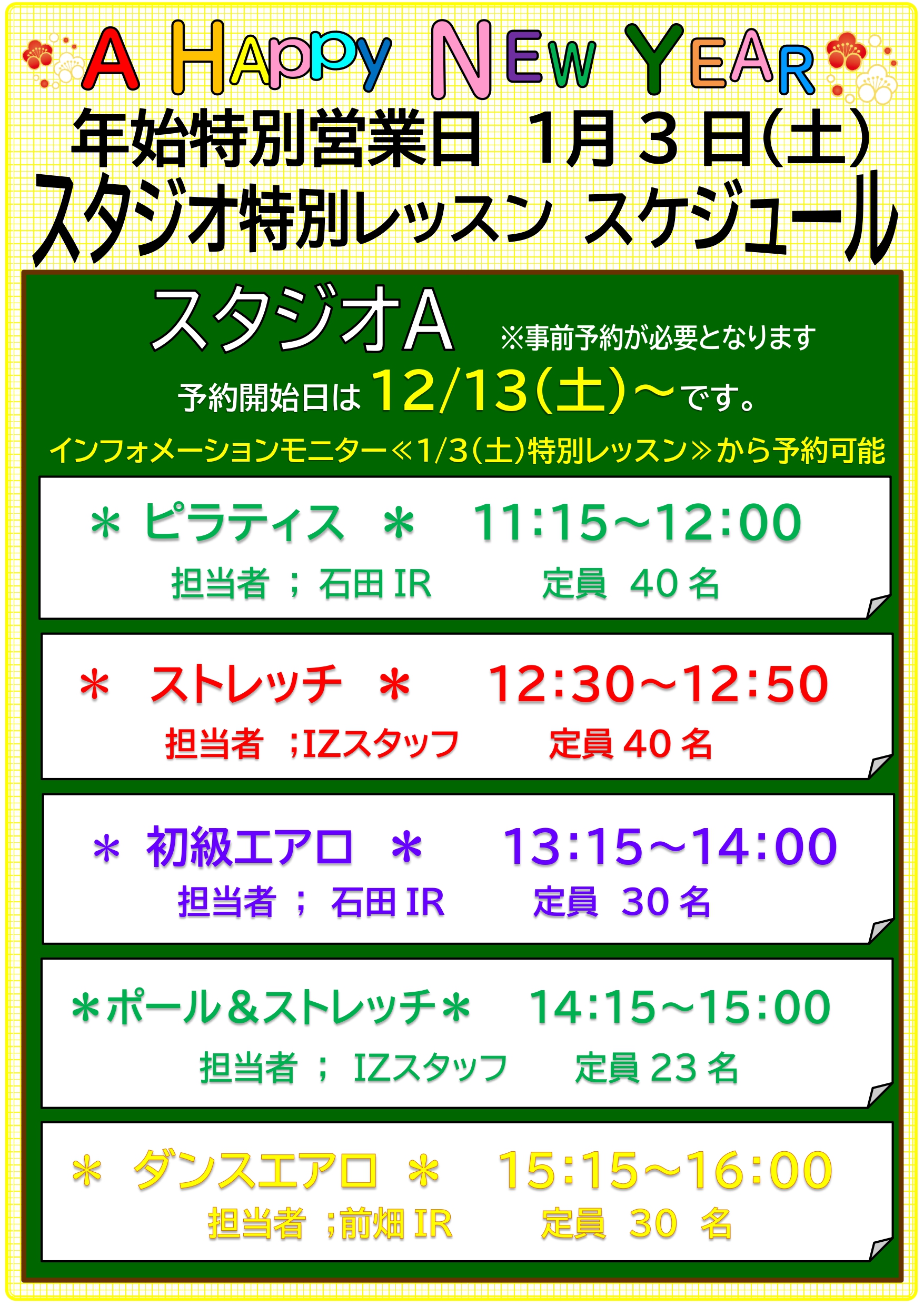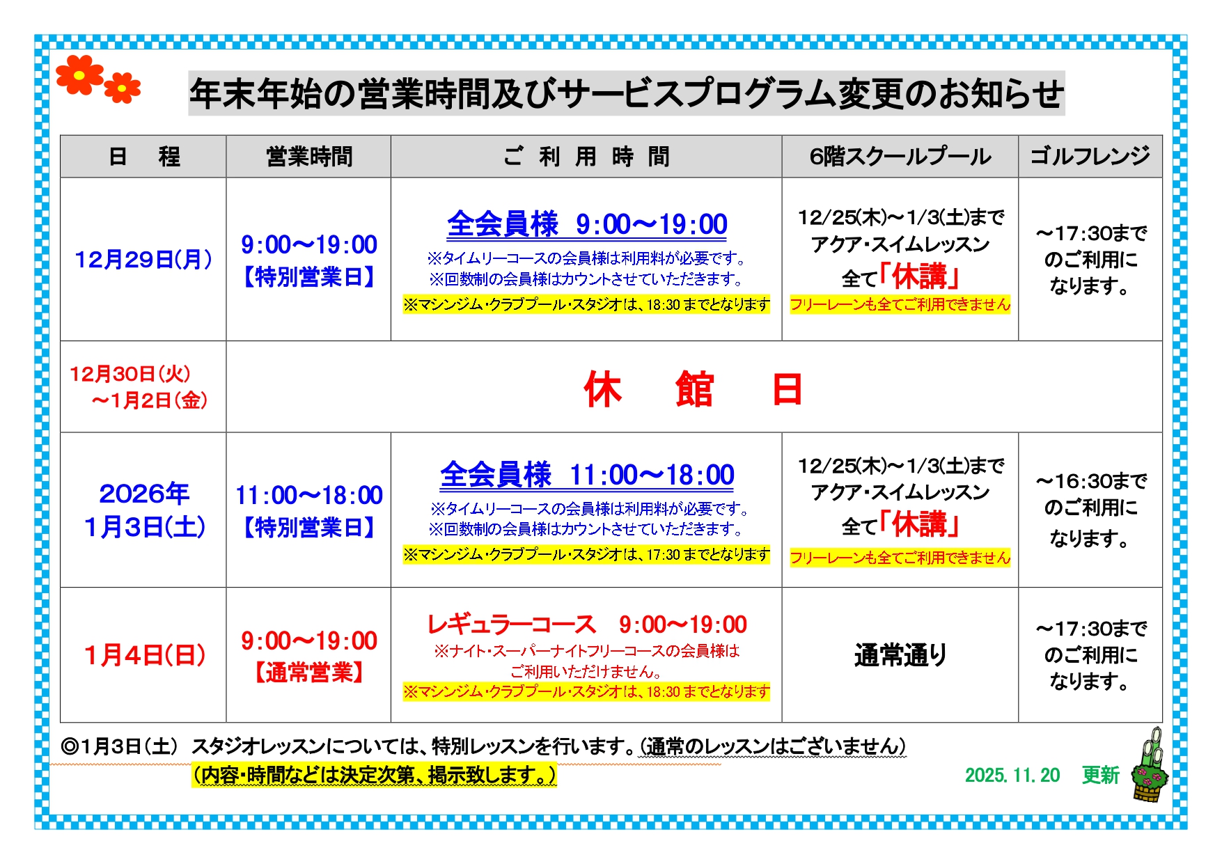 2025.12.05 年末年始の営業時間及びサービスプログラム変更のご案内 年末年始の営業時間及び サービスプログラム変更のご案内になります。 ※1/3(土)スタジオプログラムが決定しました。12/5(金)更新 詳しくはお知らせをご覧ください。 一覧に戻る