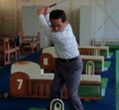 そして傾斜台での練習で、通常のスイングがよくなる方法の説明と実技です。