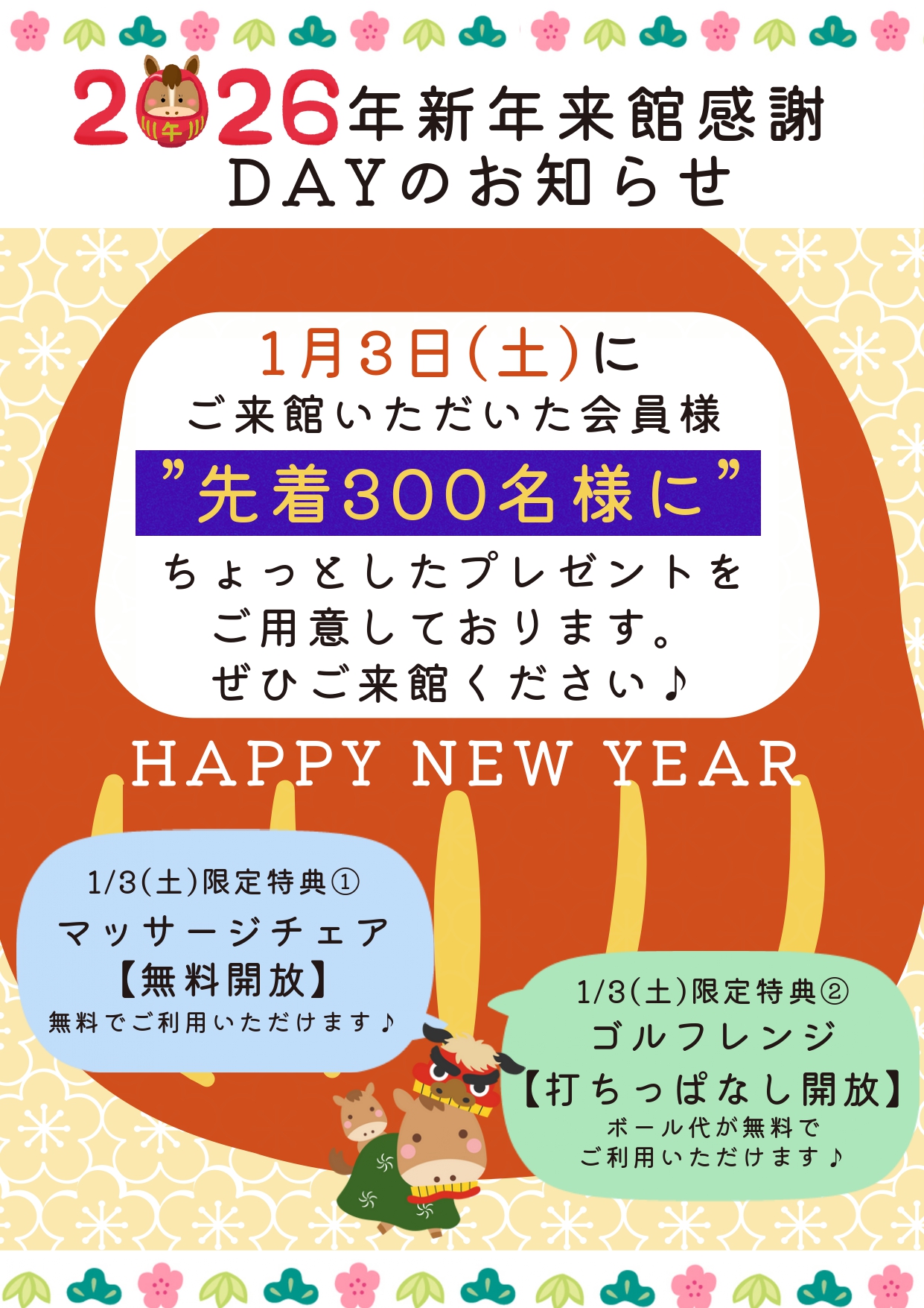 2025.12.17 『新年来館感謝DAY』のイベントを行います。 1月3日(土) ご来館していただいた方に プレゼントを用意しております。 営業時間は、11:00~18:00となります。 皆様のご来館、心よりお待ちしております。 一覧に戻る